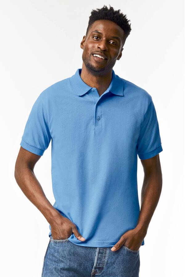 Günstiges Herren Poloshirt aus Baumwolle/Polyester Mischgewebe. Das billige Polohemd für Männer hat 3 holzfarbene Knöpfe, Doppelnähte am Bund, ein DryBlend Heat Transfer Label, eingefasste Ärmelbündchen, einen eingefassten Kragen sowie eine verstärkte Knopfleiste.