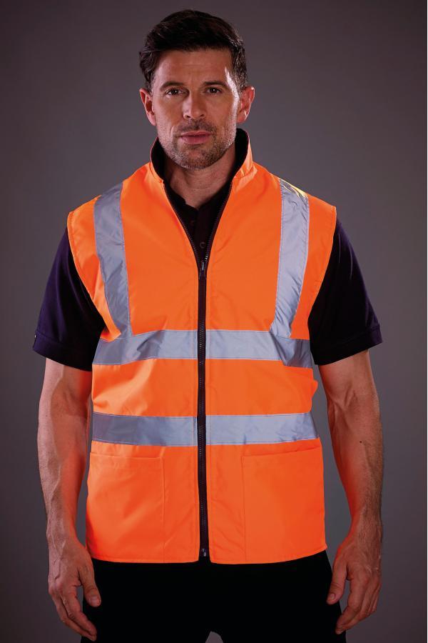 Reflektierende Fleeceweste in Signalfarben aus wasserdichtem Oxford PU-beschichtetes Polyester-Material (entspricht der Norm EN471 Class 2). Der leichtgewichtige, doppelseitige High-Viz Fleece-Bodywarmer für Damen und Herren hat einen durchgehenden Reißverschluss bis zum Kinn und zwei Handwärmer-Taschen auf jeder Seite. Der Hersteller gewährleistet die Reflektionseigenschaft gemäß EN-Norm für 25 Waschgänge. Die Fleeceweste in Leuchtfarben ist auch in den großen Größen XXL und 3XL lieferbar.