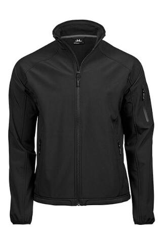 Tailliert geschnittene Herren Sport- und Freizeitjacke aus strapazierfähigem Softshell-Gewebe. Die leichte Softshelljacke für Männer ist mit einer aufgesetzten wasserdichten Ärmeltasche, zwei großen Fronttaschen mit Reißverschluss, Raglan-Ärmeln, elastischen Ärmel-Bündchen, einem Stehkragen und einem einstellbaren Saum gearbeitet.