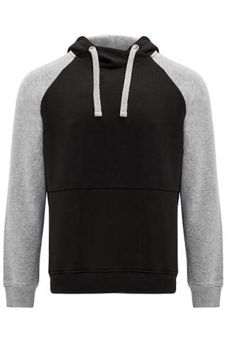Zweifarbiges Unisex Kapuzen Sweatshirt im sportiven Baseball-Design für Damen und Herren. Das Hoodie für Männer und Frauen ist mit einer Kapuze mit gekreuzten Kragen und Metallösen (innen in Single Jersey Qualität), einem kontrastfarbigen Kordelzug und Raglanärmel, einer Kängurutasche sowie 1x1 Rippstrick mit Elasthan an den Ärmelbündchen und am Saum gearbeitet. Das Label-Etikett lässt sich leicht herauslösen.
