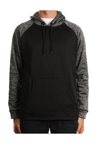 Leichtes Herren Sport-Hoodie aus Funktionsgewebe. Der dünne Sportpulli für Männer ist mit Raglan-Ärmeln, einer Beuteltasche vorn, Overlock-Nahtdetails, Arm- und Bauchbündchen sowie einer Kapuze mit schwarzem Kordelzug gearbeitet.