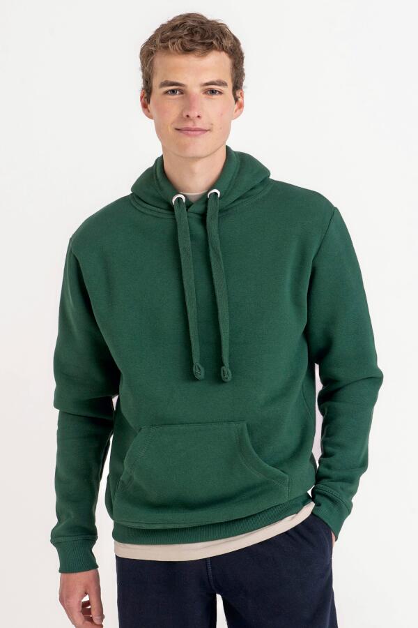 Der Sweatshirt-Stoff hat eine weiche Baumwolloberseite, innen ist er angeraut. Der pflegeleichte Kapuzenpulli ist bei 30 Grad waschbar und für den Trockner geeignet. Er wird vegan unter fairen Arbeitsbedingungen unter dem WRAP-Zertifikat für verantwortungsvolle Produktion hergestellt und ist auch in den großen Größen XXL und 3XL lieferbar.