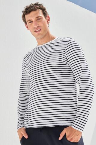 Normal gerade geschnittenes Unisex Langarmshirt im gestreiften Marine-Look für Damen und Herren. Das Baumwoll T-Shirt ist mit einem runden, elastischen Rippenhalssauschnitt, einem hinteren Nackenband aus Single Jersey, Doppelnähten und langen Ärmeln gearbeitet.
