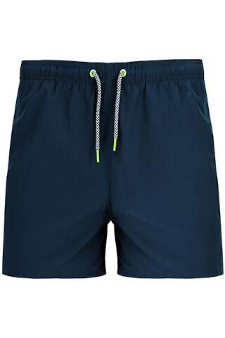 Moderne Herren Badeshorts mit seitlichen Ziernähten in Kontrastfarbe. Die kurze Badehose für Männer ist mit zwei Seitentaschen, einem elastischen Bund mit verstellbarer dekorativer Kordel und Metallösen in Kontrastfarbe sowie einer Gesäßtasche mit Ablauföse gearbeitet.