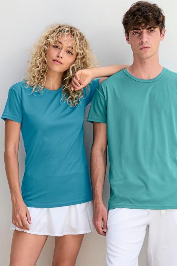 Unisex Kurzarm Sport T-Shirt aus Funktionsfasern in Piqué-Ausführung. Das Sportshirt für Männer und Frauen ist mit einem runden Halsausschnitt, Seitennähten, Set-In-Ärmeln sowie Piqué an Körper und Kragen gerabeitet.