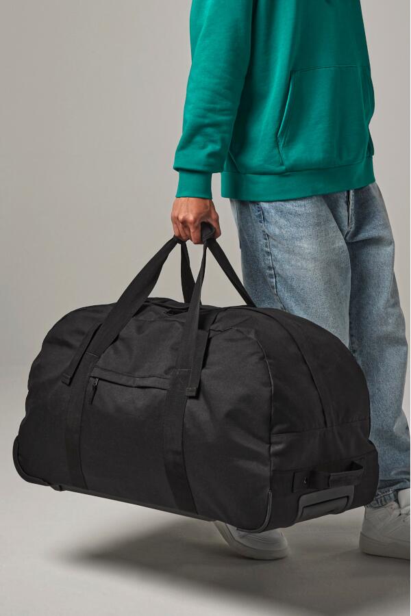 Große Sporttasche mit Rollen aus 600D Polyester. Die großzügig dimensionierte Fitnesstasche zum Ziehen hat einen gepolsterten Griff, robuste Rollen, einen abnehmbaren, verstellbaren Schultergurt mit Polster, einen versenkbaren Griff und ein Fassungsvolumen von ca. 105 Litern. Die Sporttasche mit Rollen ist in schwarz lieferbar.