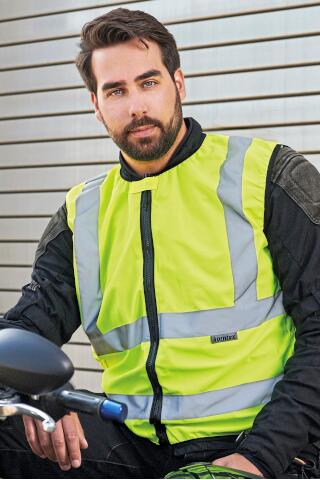 Leichte Motorrad-Warnweste in greller Signalfarbe mit Reflektoren für beste Sichtbarkeit im Dunkeln und in der Dämmerung. Die Signalweste für Biker ist mit zwei quer verlaufenden Reflektions-Streifen um den Körper und über den Schultern gearbeitet. Gummizüge innerhalb der Weste sorgen für eine optimale Passform und mindern störendes Flattern bei hoher Fahrgeschwindigkeit. Ein Klettverschluss verhindert, dass sich der Reißverschluss bei Fahrtwind öffnet.
